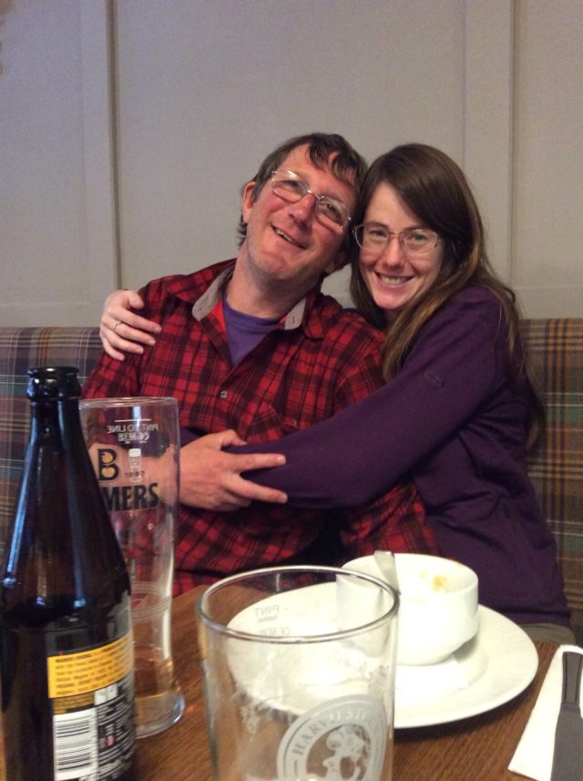 on holiday with my babe And hanging with my BFF Stayed at neat place, here’s view as Becca was sipping her wee dram (Ardbeg 14 yo) And cool views on today’s walk Got to the statue to mark the end of the WHW And celebrated with local delicacy Time to turn north-east tomorrow …. talking